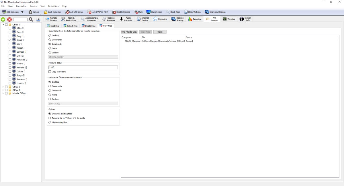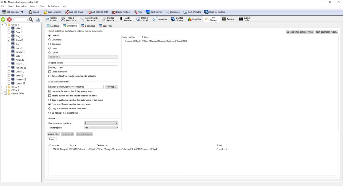 Here you can collect files from employee computers. Files will be copied to selected target folder on computer with the console.