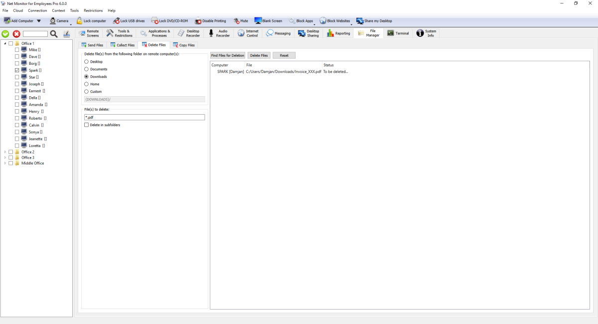 First, choose a folder on a remote computer and then enter file names separated by ";" or use a pattern (e.g., *.pdf) of files you want to delete on employee computers.