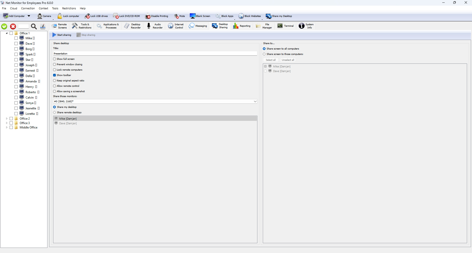 Tất cả các màn hình máy tính của nhân viên có thể được hiển thị cùng một lúc vì chúng có thể được hiển thị dưới dạng hình thu nhỏ với kích thước có thể định cấu hình.